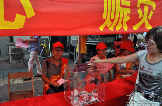 在募捐现场,舟曲灾区的宣传图片让许多过往市民停下了脚步,一些市民也纷纷将自己的爱心款投放到捐款箱里,温馨的感人场面不断涌现。