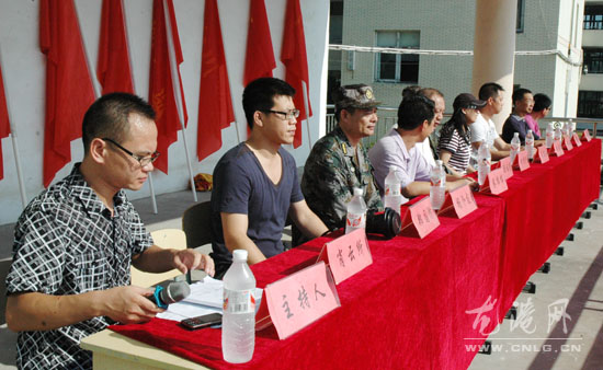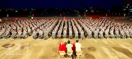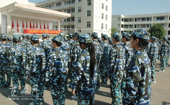 本网讯:今天上午,龙港兴港高级中学操场上国旗飘扬、军歌嘹亮,该校400余名高一新生在教官的带领下,身穿迷彩服、头戴迷彩帽、排着整齐的队列参加军训。