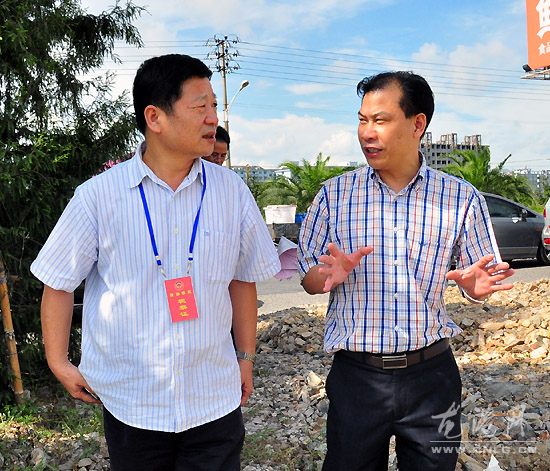 县政协主席杨成秋(左)在龙港镇长(副县长级)王忠秀陪同下视察龙港体育馆工程项目推进工作