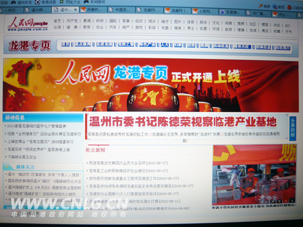 龙网8月20日讯:从8月20日始,只要您轻轻点击http://wz.people.com.cn/lg/#,就会打开一扇龙港通向世界的又有一个新窗口——人民网《龙港专页》。人民网《龙港专页》隆重上线,将肩负起“宣传龙港、服务龙港”的神圣使命。