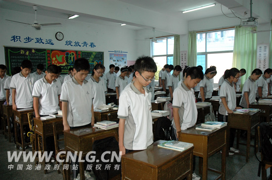 图为防空警报拉响时,龙港三中全校师生庄严肃立默哀一分钟