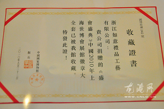 与会的县镇领导表示,这套徽章能进上海世博会、国家博物馆,体现了我镇工艺产品过硬的质量,把苍南礼品业推上了一个新台阶。同时,还将激励我县广大礼品生产、加工企业奋发图强,创造新的辉煌。
