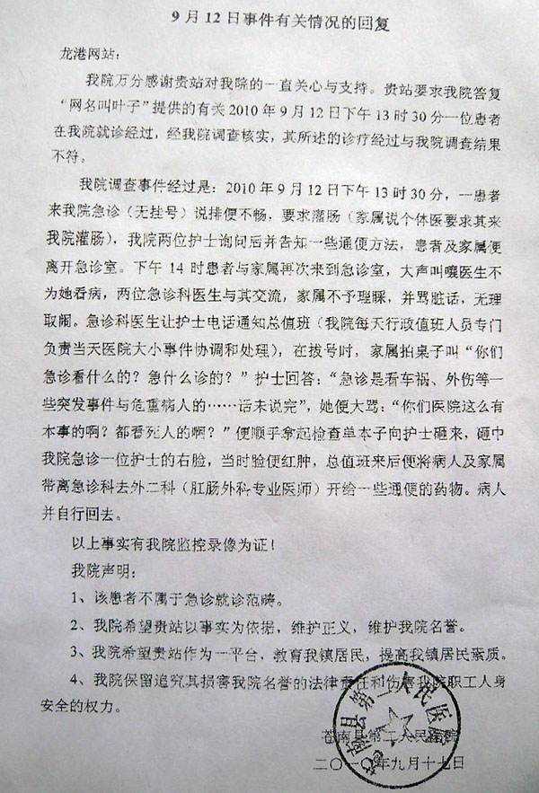 网民“叶子”投诉称:昨天下午我母亲肚子疼,一点半送进龙港医院,挂了急诊,但是医生要两点才上班。好不容易等到两点钟医生来了,可医生来了却说要上二楼消化科看,二楼又说要到急诊科看, 跑上跑下一直到三点多还是没医生看。我们家属很着急,责问急诊科是看什么的?当班的护士说我们急诊科是看死人的。我想知道,这是我们龙港的“人民医院”吗?医院的领导是做什么的,您是怎么管理职工的,您手下的职工连最起码的职业道德都没有,她配当“白衣天使”吗?还有,挂急诊科怎么会没有医生看,你龙港医院的急诊科是虚设的吗?