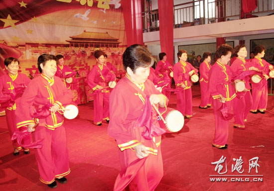 文艺演出在老年大学薛家桥文化中心表演民间腰鼓:《迎宾鼓》、《老太婆夸政府》、《梅龙镇》等节目轮番上阵,共庆祖国61华诞。