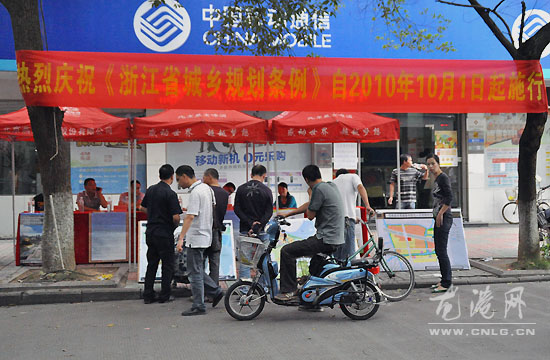 龙网9月30日讯 《浙江省城乡规划条例》将于今年的10月1日起正式实施。今天早上,县建设规划局龙港分局在建新路组织《条例》现场咨询活动,发放《浙江省城乡规划条例》单行本500多册。