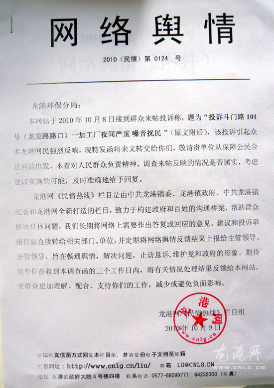 龙网10月12日讯:10月8日,一网民“倪先生”本网民情热线反映,位于斗门路101号的一家加工厂,夜间严重噪音扰民,使他们难以入睡。本网民情热线发函给龙港环保分局,要求查处。