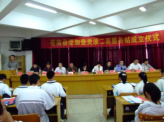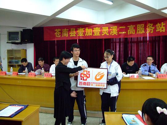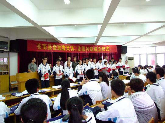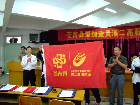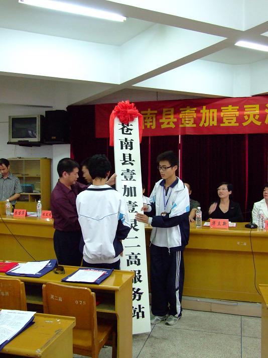 在苍南县壹加壹灵二高服务站的成立仪式上,县相关部门领导还为服务站举行授牌、授旗、授印等仪式,120学生志愿者经过庄严宣誓,成为首批苍南县壹加壹灵二高服务站志愿者。