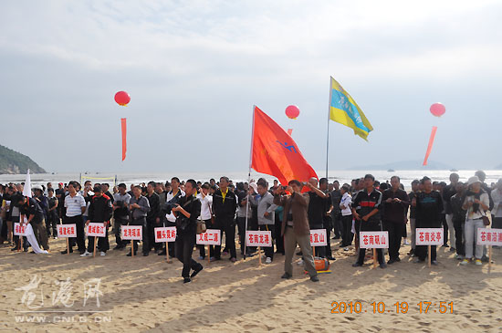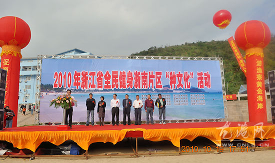 龙网10月20日消息:(黄定军摄)2010年浙江省全民健身浙南片区“种文化”活动暨“游渔寮黄金海岸 促海西体育交流”主题系列活动今天在渔寮大沙滩开幕。省、市、县有关领导出席开幕式,县委常委、宣传部长戴嘉宝致欢迎词。