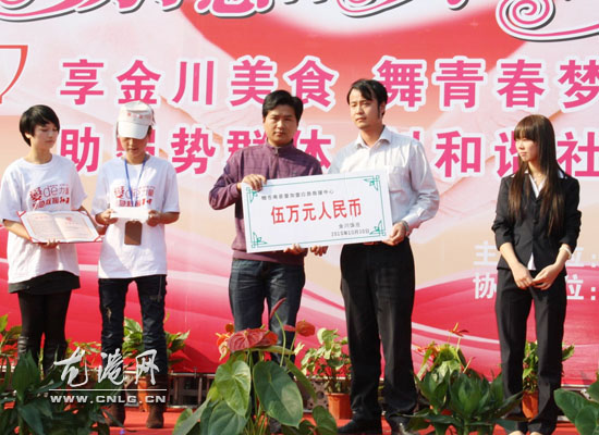本网讯:(黄春新/文 朱勇/摄)10月30日下午,金川饭庄在浙江省苍南县城怡和家园举办首届金川杯少儿慈善才艺大赛,并将3天营业额5万元捐赠苍南县壹加壹应急救援中心,作为资助孤儿、贫困生以及应急救援等公益事业。