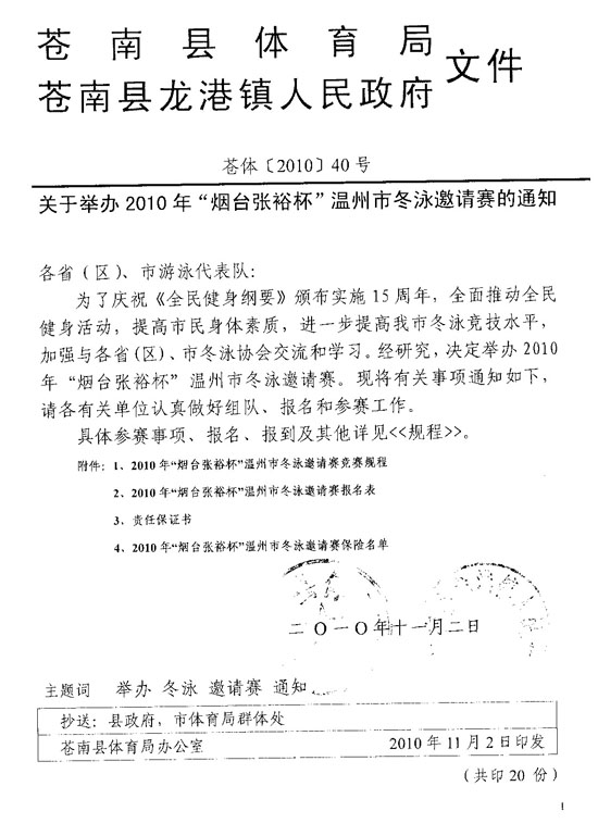 2010年“烟台张裕杯”温州冬泳邀请赛竞赛规程