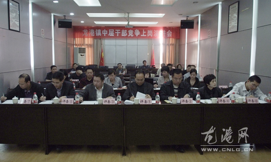 本网讯:昨天下午,龙港镇举行中层干部竞争上岗演讲会,镇机关部门和办事处的31位竞选者参加了这次中层正职和副职干部竞选活动。镇人大主席上官光强等领导出席了演讲会。