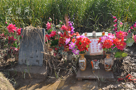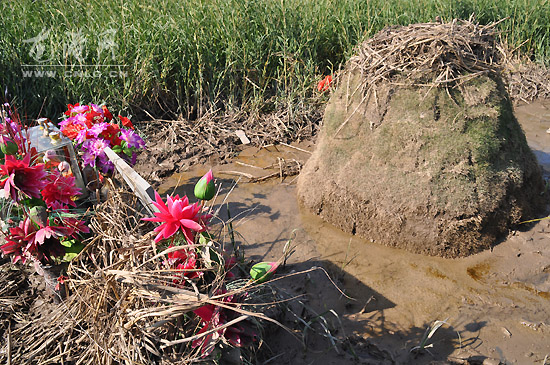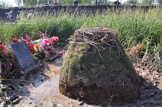 今天早上8点许,记者来到龙港公园外滩江堤外,发现离江堤外5米处有一座圆形土堆,高度大约1.2米,直径大约为1.4米,该座土堆1米处有块青石墓碑,旁边有香炉、“纸币”和4个塑料花瓶组成。