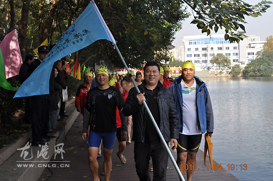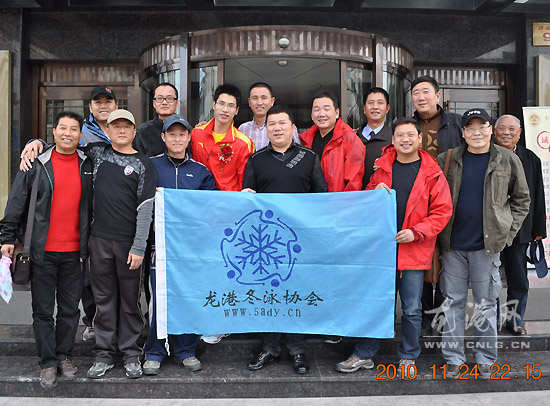 龙港冬泳协会爱好者与游泳冠军吕志武合影