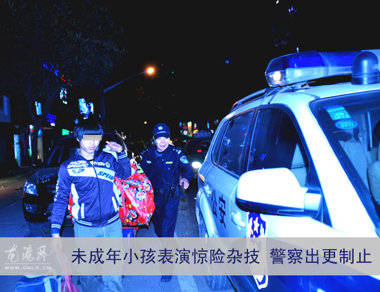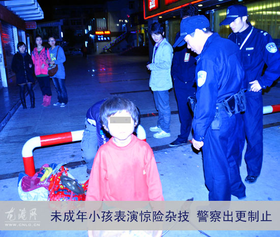 龙网12月4日讯:(值班记者陈 记 薛建贺)今天晚上10点12分许,本网热线68099777响起,苍南某中学高三段学生林同学来电称:“在龙港影剧院前,有3名未成年小孩表演惊险杂技,他怀疑,有人在背后利用小孩子骗钱”,记者接到电话后,第一时间与龙港公安分局副教导员林靖取得联系并立即赶赴现场。