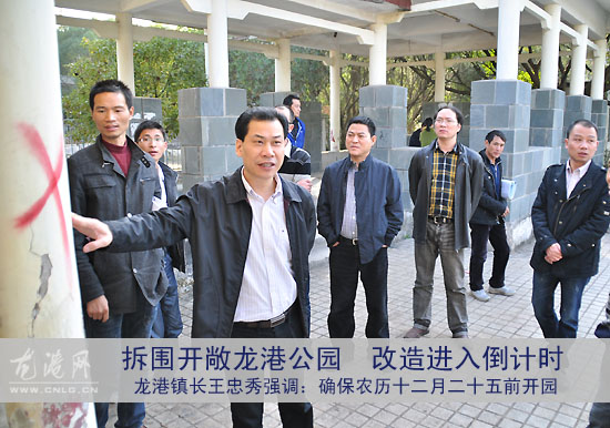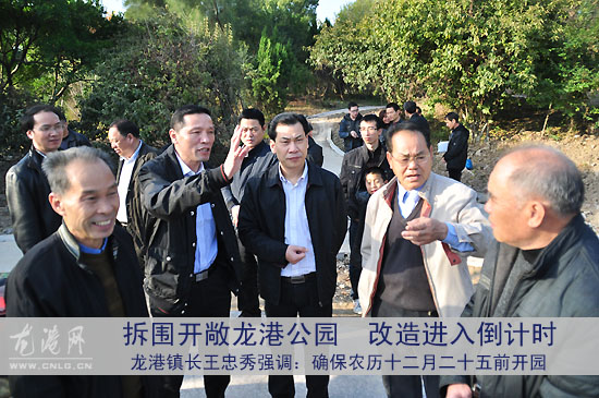 龙网12月4日讯(记者 陈 记)去除围墙、造草坡、种植大树……龙港公园将于2010年农历十二月二十五前开园。今日下午,龙港镇长王忠秀,县文化新闻出版局局长李晖华,副镇长吕存阳带领镇城建局、综合文化站、城管园林负责人来到龙港公园调研改造情况。