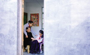 两个女孩与余上忠老人亲密无间。