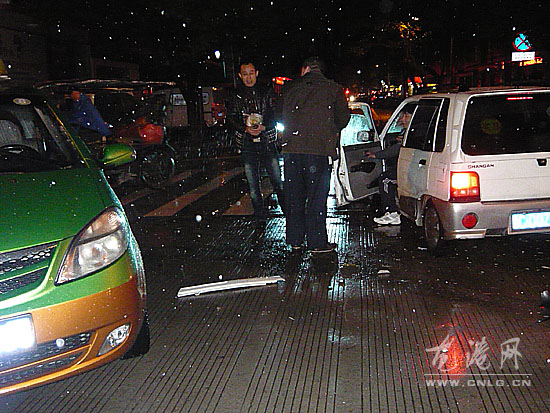 12月15日22点22分,记者在镇前路与建新路十字路口,看到两辆小车因大雪纷飞行驶发生刮擦事故,没有造成人员受伤。