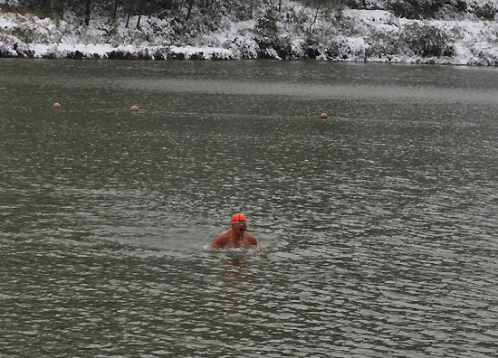 上午9点,记者特意驱车来到平阳罗阳山,在罗阳山水库上,记者就远远看见龙港冬泳人,很佩服他们的勇气和毅力,不管什么天气,他们都来到水库,都要到水里泡一泡,龙港冬泳协会“牛哥”说:“痛苦一时,快乐一天,幸福一辈子。”