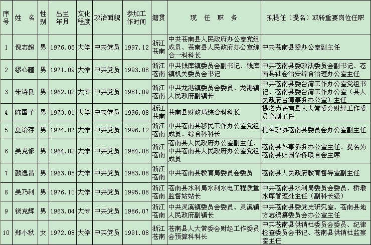 根据《党政领导干部选拔任用工作条例》和中共苍南县委《关于试行领导干部任前公示制的意见》(苍委发〔2005〕54号)的要求,现将县委常委会研究的拟提任或转重要岗位任职干部的有关情况予以公示,征求广大干部、群众意见。