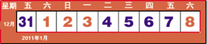根据《国务院办公厅关于2011年部分节假日安排的通知》,2011年元旦放假时间为1月1日至3日,共3天(图中红色为假日,蓝色为工作日)。