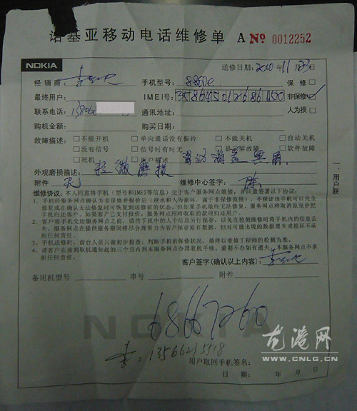 龙网12月29日讯:(陈记 雯雯 福存 定军)昨天,本网民情热线68099777响起,李先生讲诉自己一部万元诺基亚8800Arte手机因显示屏接触不良,经常若有若无。于11月23日将手机送到龙港镇龙跃路226-228号的诺基亚龙港专卖店(龙港百川通信器材商行)特约维修点“维修”,维修费为1050元,该专卖店开具一张编号:0012252诺基亚移动电话维修单,故障原因:滑动滑盖黑屏。12月26日,李先生接到诺基亚龙港专卖店工作人员来电说,机子已经修好了。李先生取机时,细心的他发现诺基亚8800Arte手机有问题,感觉有点不对,就问该店的员工,这个手机手感不对,外壳跟原先的不大一样。该店员工表示这是不可能的事情,说是原来的手机。李先生回家后,越看手机越不像以前的样子,自己手机已经用了2年了,金属外壳有些褪色,而拿在手里的的诺基亚8800Arte外壳是崭新的,与原先的外壳明显的不一致,而且原有正宗的外壳和水晶钻已被“偷梁换柱”,于是他拨打了68099777民情热线请求帮助。