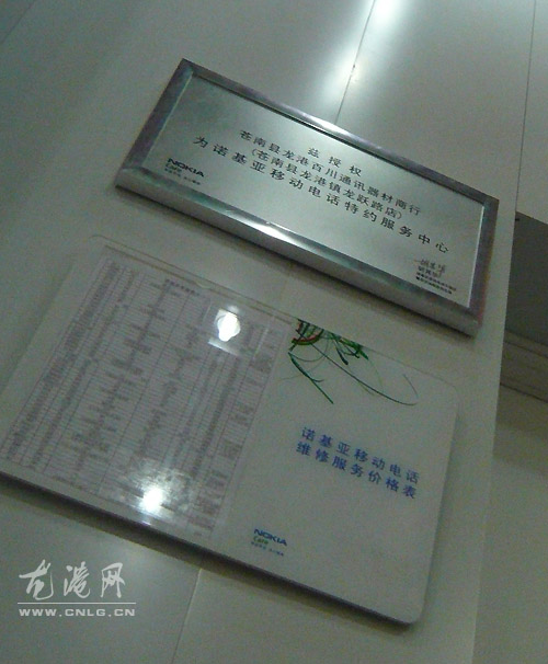 诺基亚龙港专卖店(龙港百川通信器材商行)出具了一张诺基亚三级维修中心手机报价清单传真件。经本网核实属于假冒传真件,自己盖上“诺基亚专卖店保修专用章”。