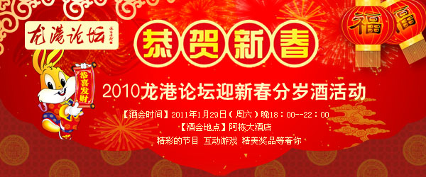 时光飞快,日月如梭,龙港论坛一年一度的【迎春宴会】大型网友聚会活动又轰轰烈烈的拉开了序幕,这是一个属于我们网友的特别日子,由我们论坛的网友自发组织筹备,策划的一个大型宴会。让我们由网络转至现实中,见一见那些让我们好奇的活跃ID,谁顶过你的贴,谁拍过你的砖,谁抢过你的沙发!你还在等什么,赶紧来报名参加吧!