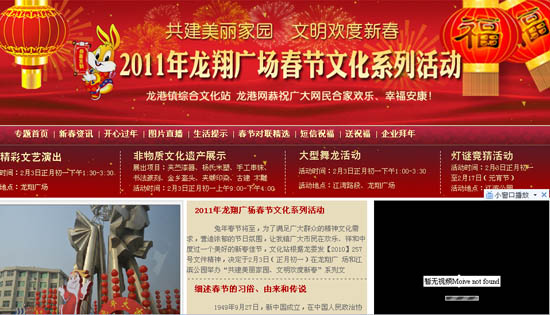 兔年春节将至,为了满足广大群众的精神文化需求,营造浓郁的节日氛围,让我镇广大市民在欢乐、祥和中度过一个美好的新春佳节,文化站根据龙委发【2010】257号文件精神,决定于2月3日(正月初一)在龙翔广 场和江滨公园举办“共建美丽家园、文明欢度新春”系列文化活动,具体安排如下: