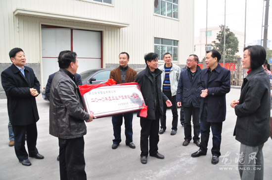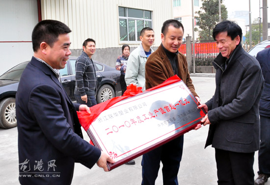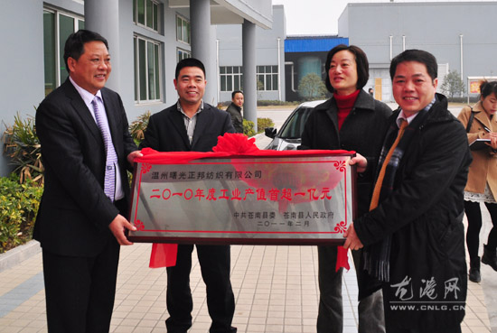 龙网2月10日 (陈记)昨天,新年上班的第一天,县委副书记、县长董庆华,县政协主席杨成秋,县委常委、常务副县长邱华萍,县委常委、龙港镇委书记林万乐,县人大副主任蓝德超,龙港镇长王忠秀(副县长级)为2010年度工业产值首次超3亿元、1亿元的龙港6家企业曙光正邦纺织、诚德包装、强盟股份、联华塑业、华昊化纤塑业、博强铜业送匾以示庆祝。掌声,送给为我县去年经济发展和社会进步做出贡献的功臣。