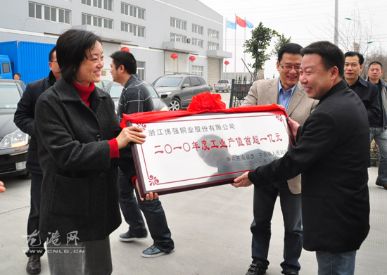 金匾是一份荣誉,也包含着沉甸甸的期望。温州博强铜业有限公司去年工业产值首次突破1亿元大关,成为此次授匾企业中的新军。在授匾仪式上,董庆华勉励说,希望在新的一年,博强铜业有限公司能以此为契机,继续加大国际国内市场的开拓力度,加大设备更新力度,奋发进取、开拓创新,在新的高度实现新跨越。