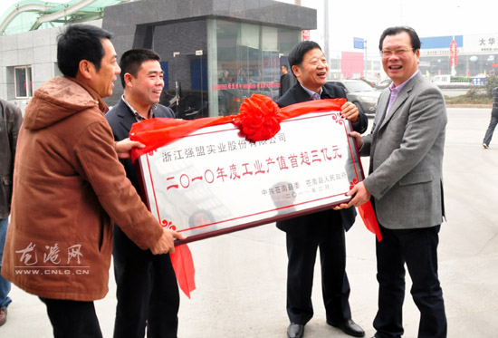 金匾送来了祝贺,更送来了信心。从县委副书记、县长董庆华,县政协主席杨成秋手中接过庆贺其产值突破3亿元的金匾时,浙江强盟股份有限公司董事长易志龙表示,将继续紧跟市场的脉搏,抓住发展机遇,不断完善产业链,在新的起点上,实现更好更快的发展,为苍南经济社会发展作出更大的贡献。授匾企业浙江强盟股份有限公司全体员工意气风发,表示将紧紧抓住龙港发展的大好时机,继续发挥优势,努力再创新的业绩,2012年实现工业总产值5亿元的目标。