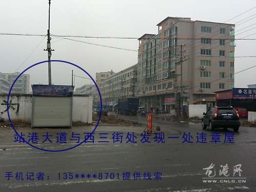 龙网2月28日讯:昨天,我路过在站港大道发现,西三街与站港大道路口处有一间房产中介违章屋,房产中介牌还放到道路上,请求城管部门查处。