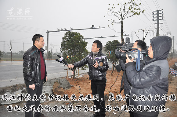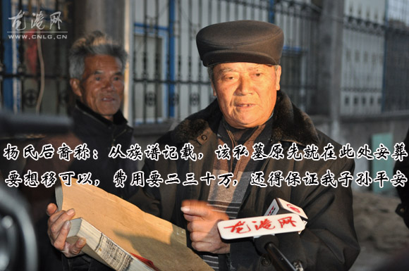 凤江村书记告诉记者说,该墓地属于凤江村上叶垟自然村杨家,至今已有200年了,昨天才知道村民杨某一行在世纪大道旁修建新坟墓,他表示立即与杨家联系。半小时后,该墓后裔杨家一行5、6人来到墓地现场,拿着杨家宗谱称:从杨家宗谱记载,该墓地原先就在此安葬。只是现在龙港发展需要,这里刚好是世纪大道,企业也办这里,要想迁移坟墓可以,费用大约要二三十万,还得保我们子孙后代平平安安。