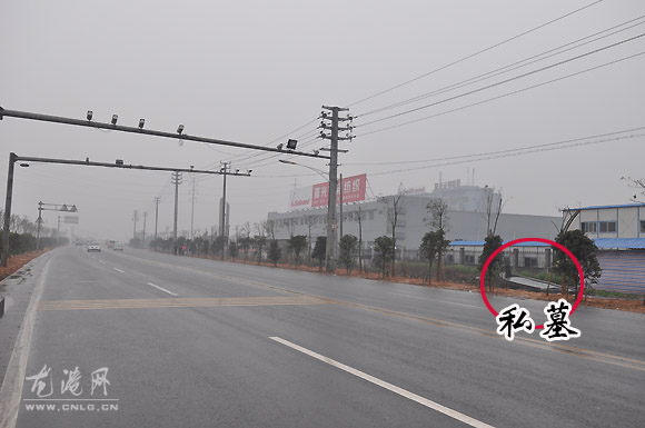 昨日下午,本网记者和龙港广电记者一起赶到世纪大道。记者一行来到了世纪大道路边旁。一座坟墓映入眼帘,而在其周边6米处则是企业厂区大门口。