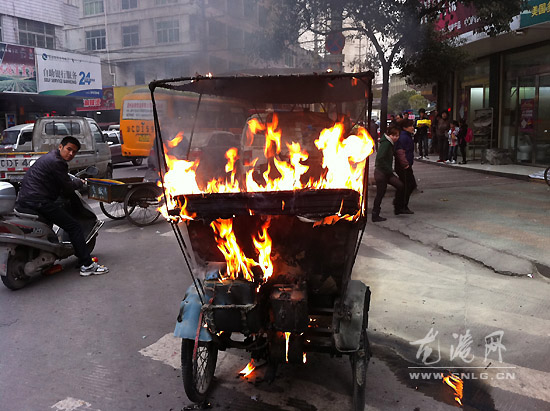 龙网3月11日讯:动力三轮车加装动力后上路非法载客营运,横冲直撞,惟利是图,出了事故只有逃之夭夭,无视道路安全法规与民众人身财产安全,不仅严重影响了辖区交通秩序和城市形象,扰乱社会治安秩序,更埋下极大的交通安全隐患,是交警部门严厉打击的“三小车”之一。3月10日下午,龙港交警队在打击查处动力三轮车的行动中,遇车主暴力抗法,引燃整瓶汽油起大火,幸而执勤人员奋力扑救,及时解除险情,无人伤亡。