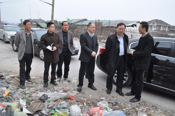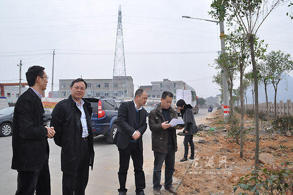 戴嘉宝一行先后来到沿江路对我镇近段时间以来的植树绿化和环境卫生整治工作进行实地调研
