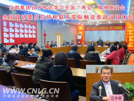 刚刚从北京参加全国“两会”归来的全国政协委员、浙江省礼品行业协会会长、仪邦集团董事局主席应仲树,在座谈会上畅谈了他在全国“两会”期间参政议政的心得体会。会议由仪邦集团党委书记、政治处主任、副总裁陈如奏主持。