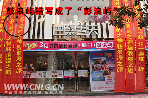 龙网3月23日讯:今天上午,我镇龙港论坛一网民来电称“龙跃路的巴黎春天婚纱摄影店挂出了6条布条幅广告,有4条错别字,把厦门的鼓浪屿错写成了“彭浪屿”,实在不应该。