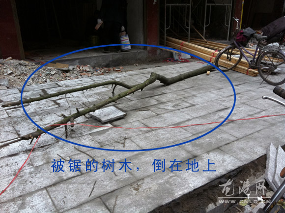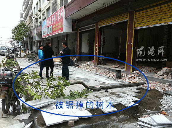 龙网3月24日讯:我镇西城路37-49号六间店铺重新装修店面及改造人行道。该几家店铺为了自己的利益,私自砍掉了挡在门前的树木,原因就是人行道让其经营空间“缩水”了,只好锯掉树木腾出空间!