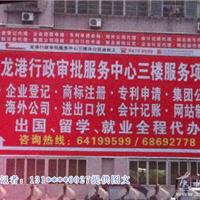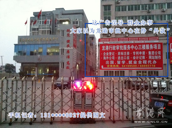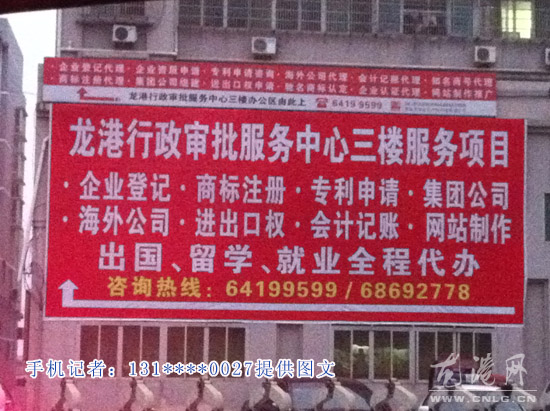 龙网3月29日讯:3月28日,我下班路过柳南路龙港行政审批服务中心门前发现一处红色喷绘广告“龙港行政审批服务中心三楼服务项目、企业登记、商标注册、专利申请、集团公司、海外公司、进口口权、会计记账、网站制作、出口、留学、就业全程代办”。这广告有涉嫌误导群众,大家以为是龙港行政审批服务中心在代办这些业务,在挣“外快”。希望该广告主更正一下!