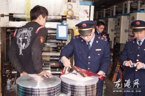 图为县工商局联合龙港工商分局在全镇范围内开展"斩草一号"商标印刷业专项整治行动