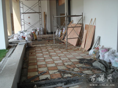 记者现场看到,该通道的天花板上已按好了三合板。地面上有一批装满建筑垃圾的尼龙袋和装修手架。还有一些被损坏的大理石粉磨、石泥灰和积水,十分凌乱。