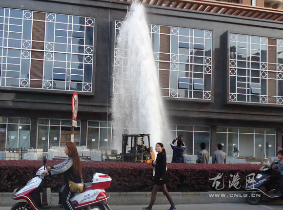 龙网4月21日讯:(本网陈记 特约记者杨昌顺)4月20日18:10分,记者接到热心网民-“若飞”和“黄鱼”来电称:龙港大道和西三街路口乐港名苑门口一辆铲车运输玻璃时压断自来水管,喷出了高达10米的水柱。