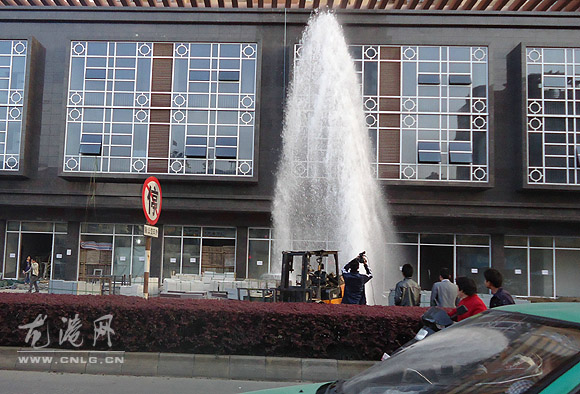 目击者三轮车夫陈先生说,他骑三轮车从西四街往西二街路过乐港名苑门口前,只听见“嘭”的一声巨响,他看见一辆铲车在运输玻璃,可能是铲车超负荷载重,压断了下面水管,水柱就喷薄而出。