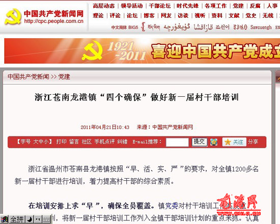 龙网4月21日讯:2011年04月21日中国共产党新闻网报道:《浙江苍南龙港镇“四个确保”做好新一届村干部培训》全文如下: