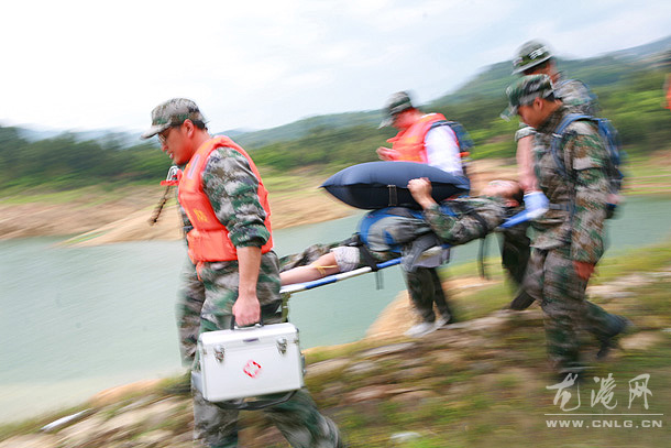 这时,在水上待命的救援人员接到指挥中心指示,驾驶冲锋舟朝着烟雾升起的方向驶去。定位后,跟随搜救犬,救援人员攀爬至被困村民处,医疗人员迅速将负伤村民抬上担架,一边坐上冲锋舟一边连线指挥中心。岸上,接送车接令发动准备,将被困村民转移到安全地方。