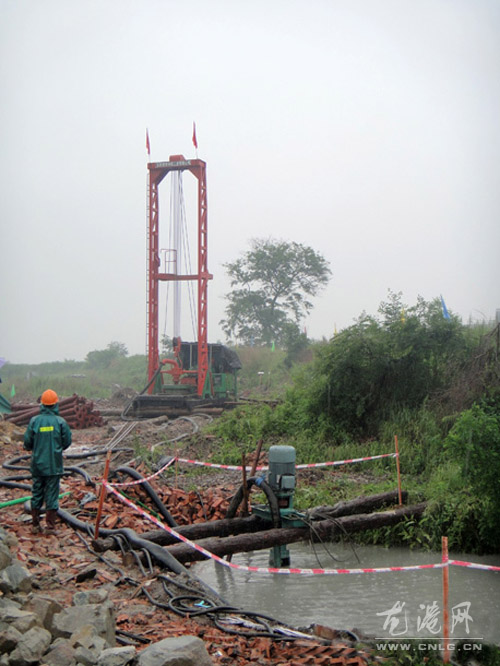 图为灵海公路横阳支江桥首桩现场