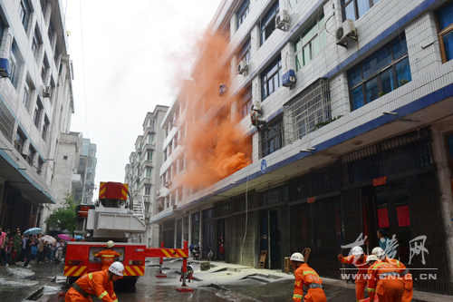 16时44分,按照模拟方案,小区再遭导弹袭击,火灾警报响起,消防组迅速解救、转移被困居民,伤员被及时包扎撤离。