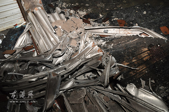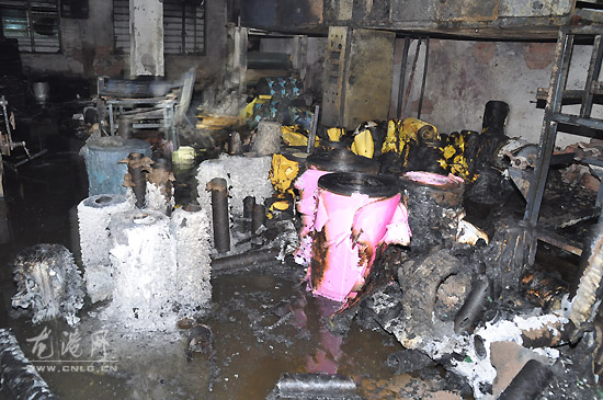 图为涂胶车间设备及材料被烧毁