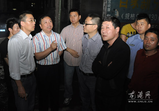 镇领导吕存阳(左二)带领城南办事处书记翁跃文,龙港安监局局长高满胜在现场察看灾情